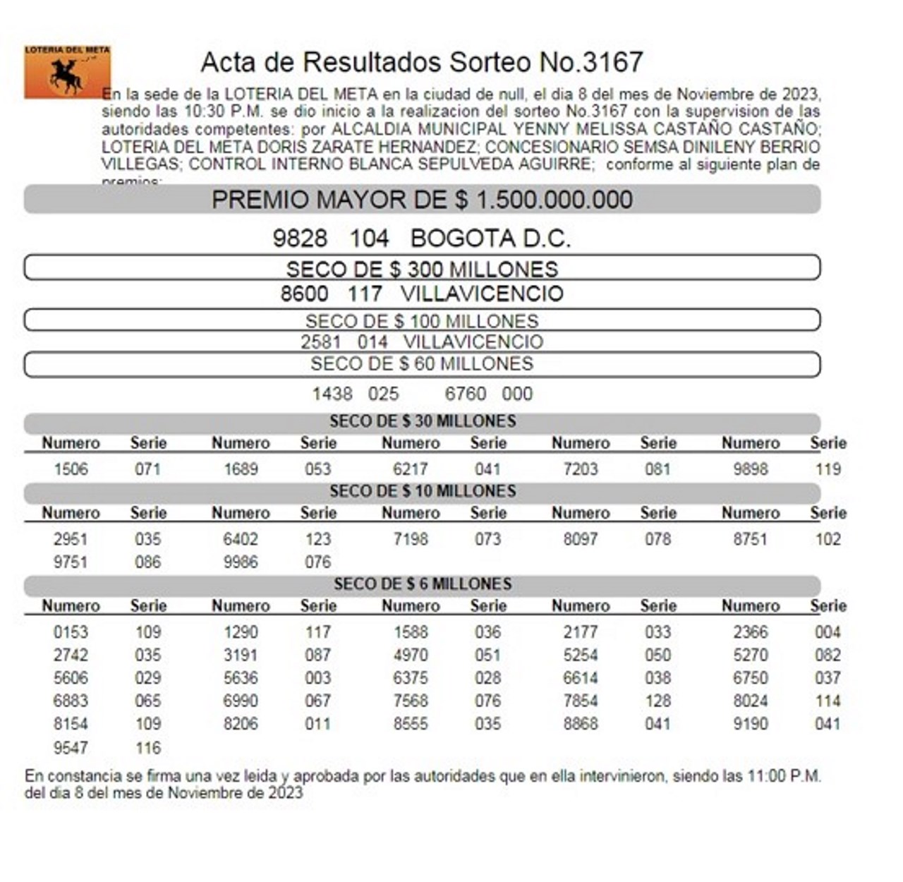 El número ganador del sorteo 3167 de la lotería del Meta, jugado el 8 de noviembre es… 9828, de la serie 104.