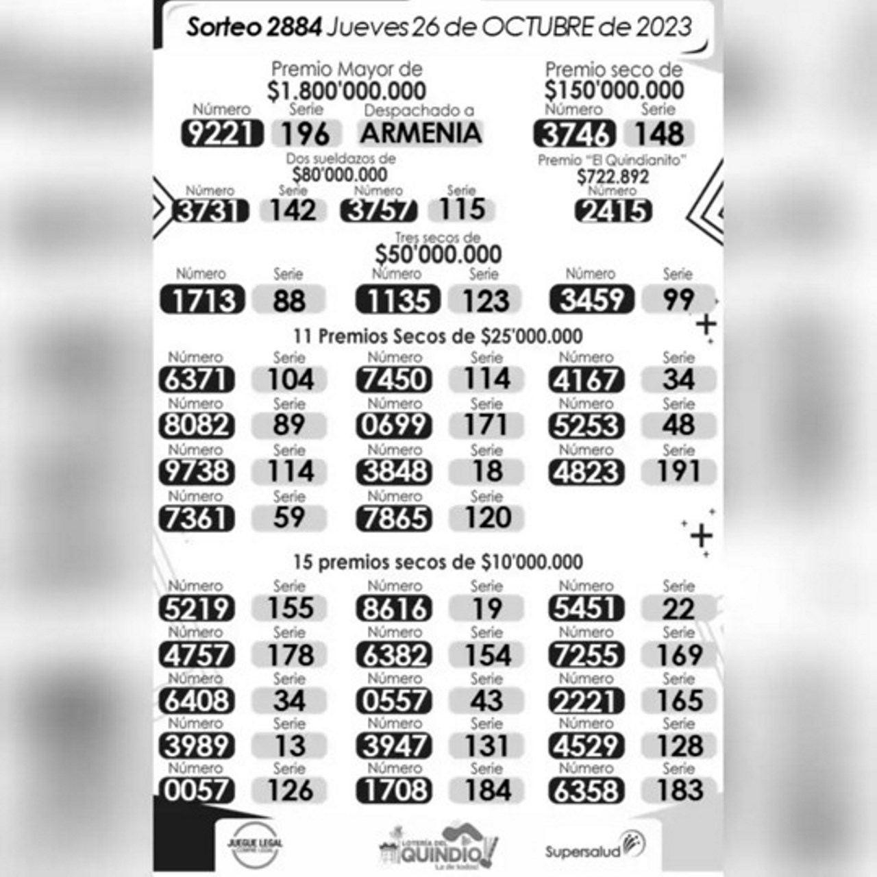 El número ganador del sorteo 2885 de la Lotería del Quindío, jugado el 26 de octubre es… 9221, de la serie 196.