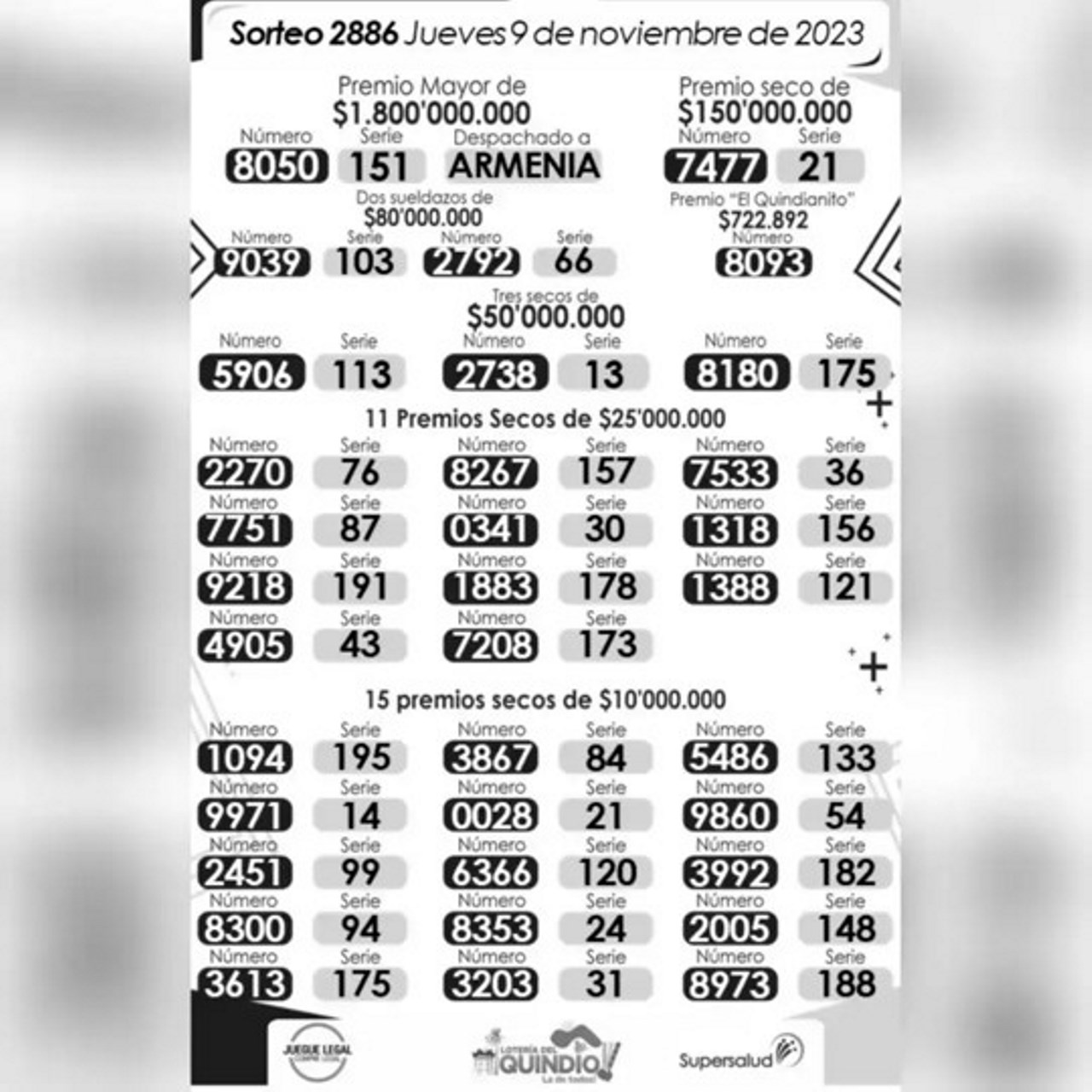 El número ganador del sorteo 2887 de la Lotería del Quindío, jugado el 9 de noviembre es… 8050 de la serie 151.