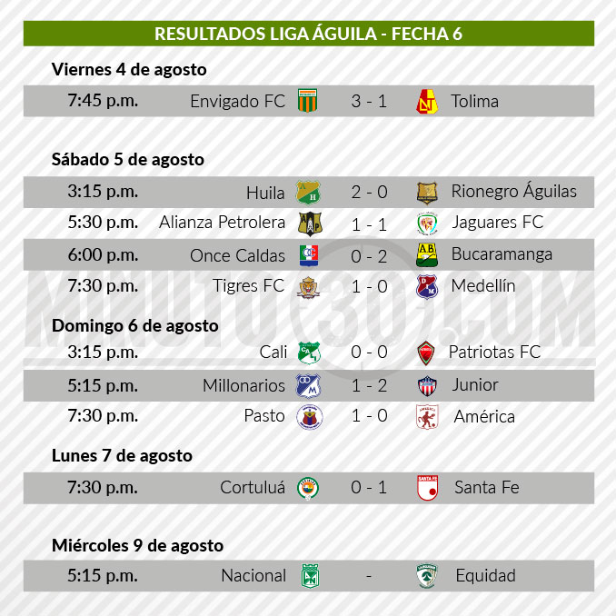 La jornada aún tiene pendiente el partido entre Atlético Nacional y La Equidad, que se disputará este miércoles a partir de las 5:15 p.m. en el Atanasio Girardot.