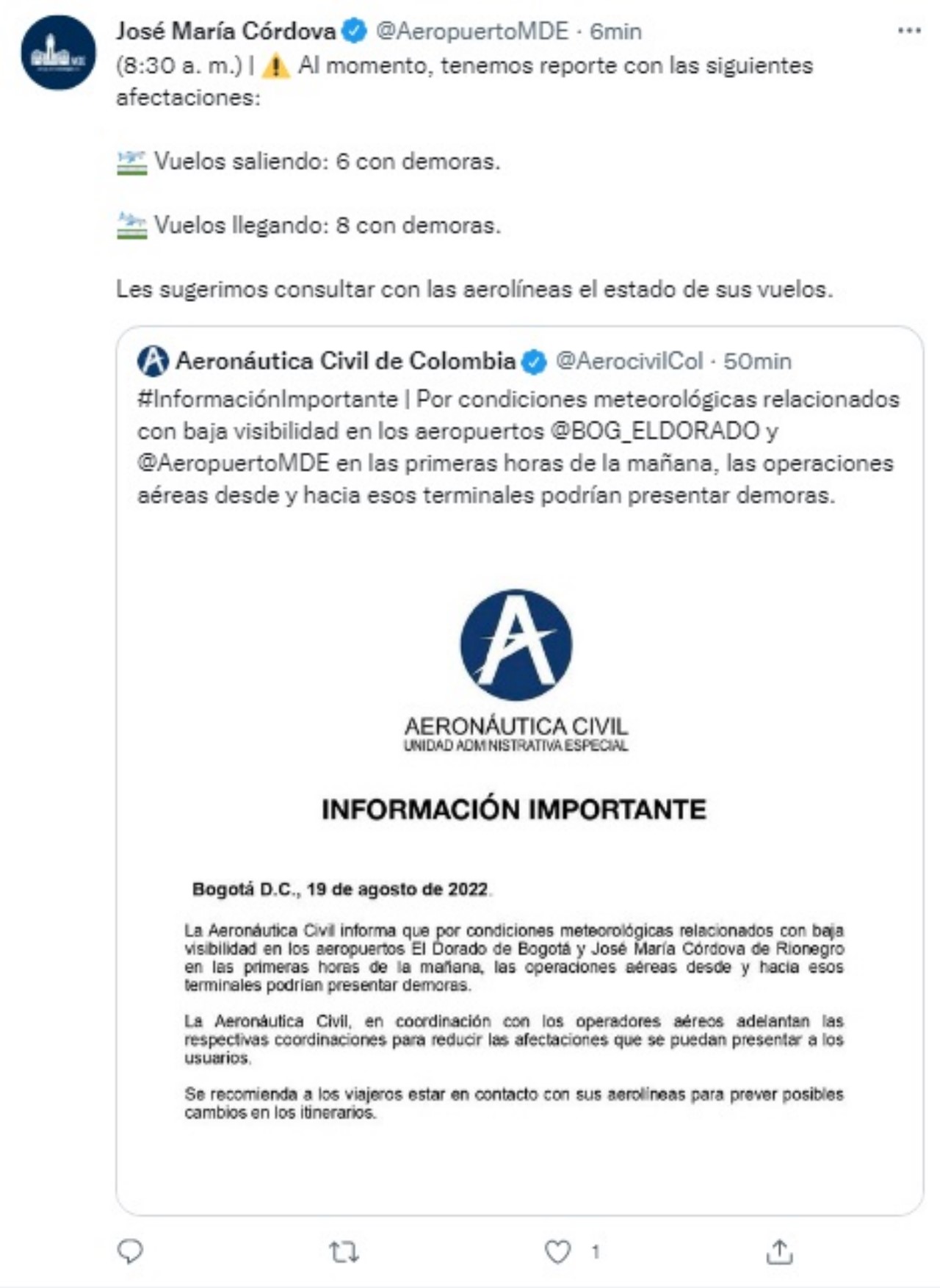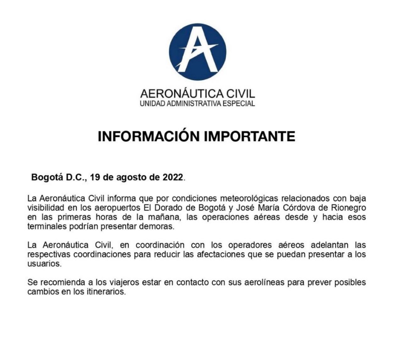 Por medio de su cuenta de Twitter, “La Aeronáutica Civil informa que por condiciones meteorológicas relacionados con baja visibilidad en los aeropuertos El Dorado de Bogotá y José María Córdova de Rionegro en las primeras horas de la mañana, las operaciones aéreas desde y hacia esos