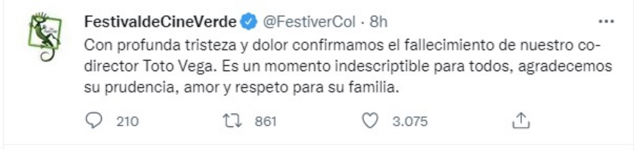 En la mañana del 26 de septiembre a través de la cuenta de Twitter del Festival de Cine Verde de Barichara (Santander) se conoció que el actor, Ariosto Vega, recordado por su seudónimo ‘Toto Vega’, falleció en las horas de la madrugada a causa de un ataque cardiaco.