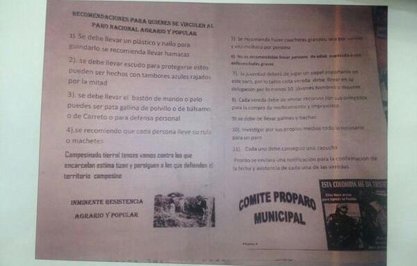 El ministerio de Defensa Nacional reveló a medios de comunicación, una fotografía de un supuesto panfleto de las FARC en el que promueve el Paro Nacional Agrario.