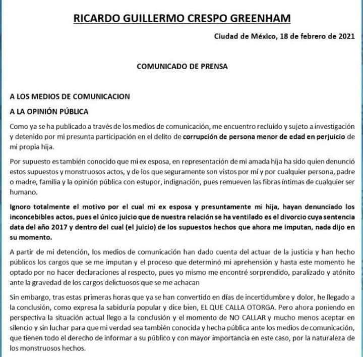 El actor mexicano Ricardo Crespo afirmó a través de un comunicado que se encuentra ‘paralizado y atónito’ tras su captura por presunto abuso sexual de su hija.