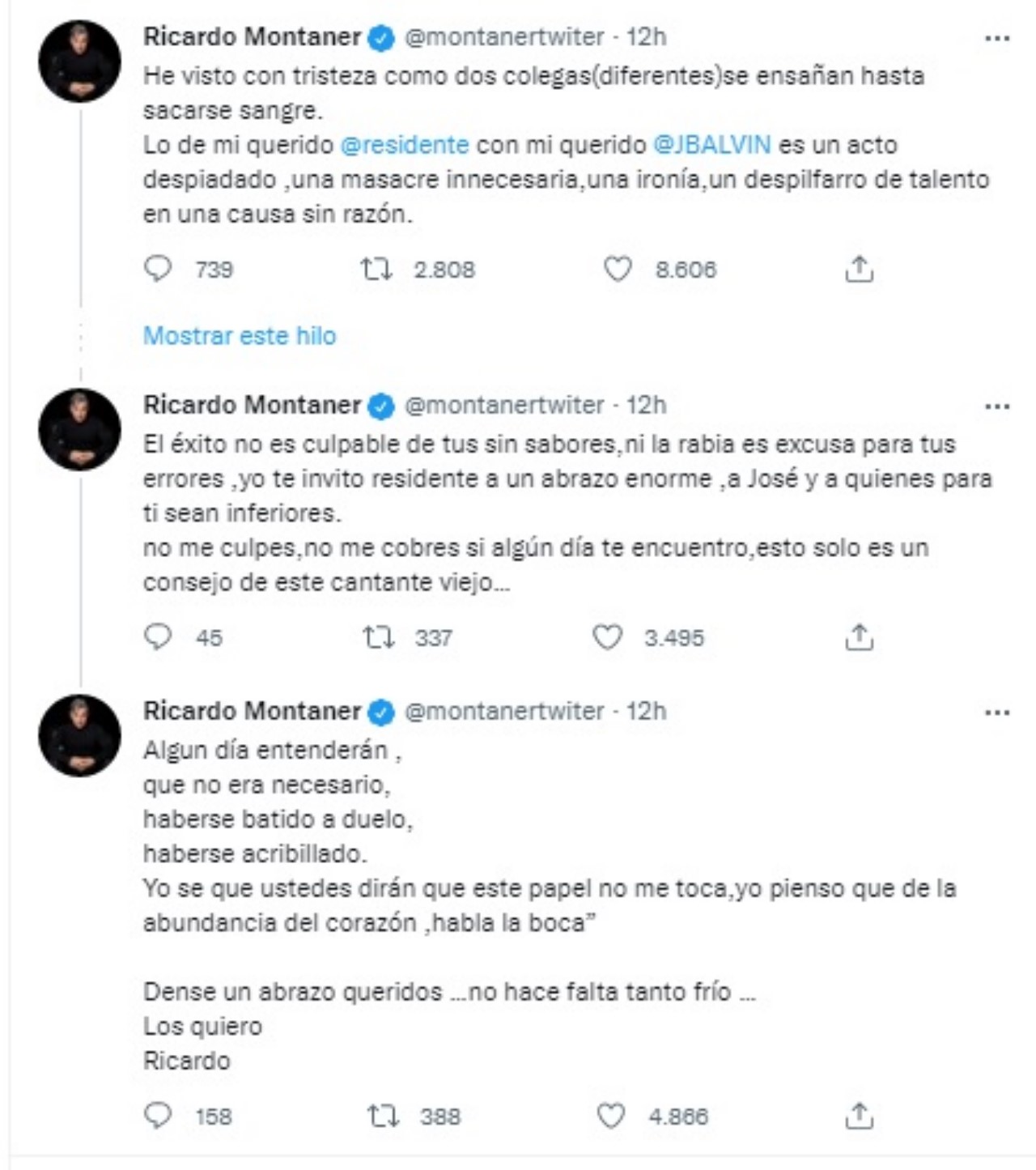 Ante dichas palabras, Ricardo Montaner escribió en su cuenta de Twitter: “He visto con tristeza como dos colegas(diferentes)se ensañan hasta sacarse sangre. Lo de mi querido