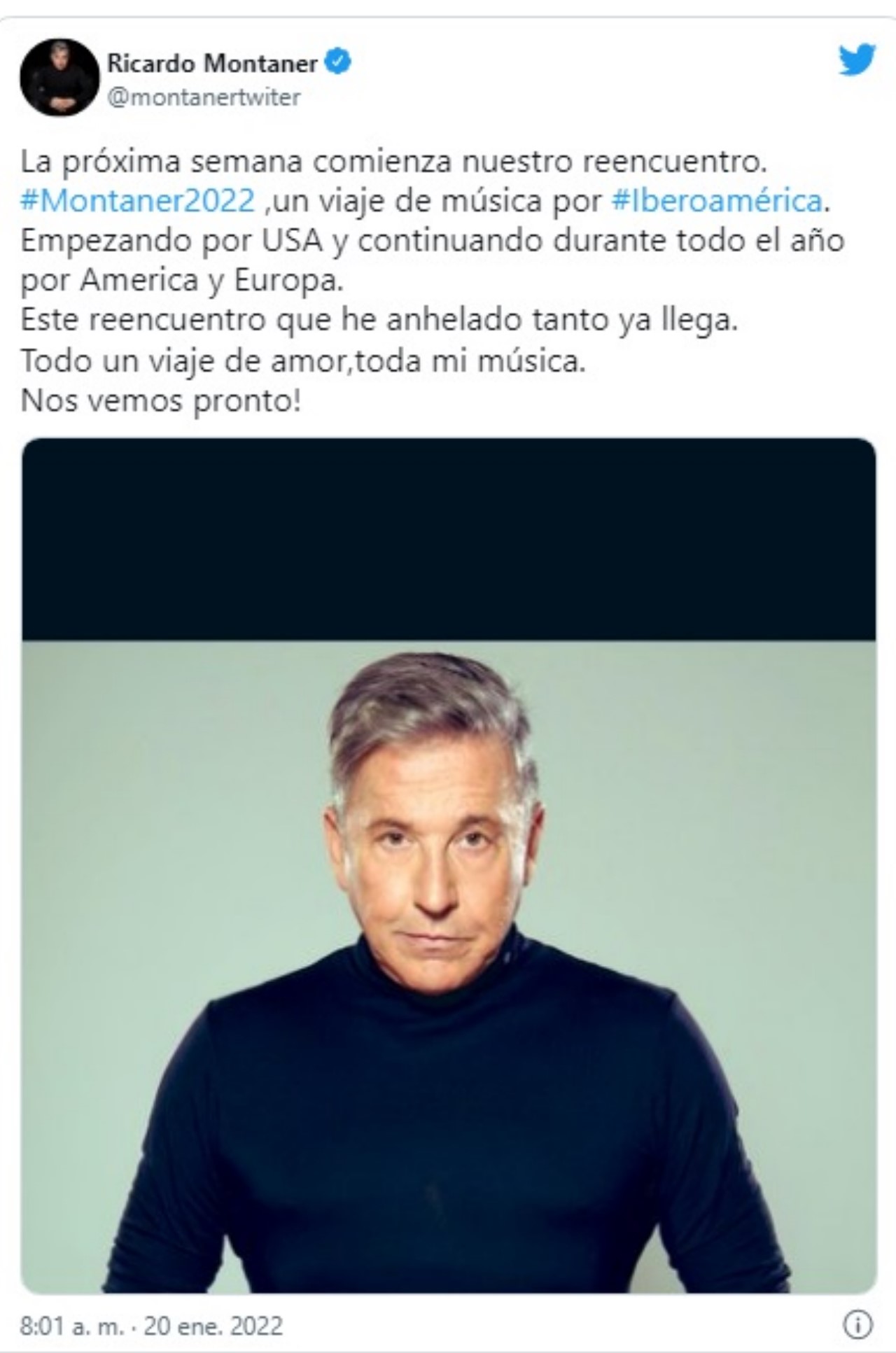 A través de sus redes sociales el cantante Ricardo Montaner informó que tuvo que cancelar algunos de sus conciertos en Estados Unidos luego de que algunos de sus músicos dieran positivo para covid.