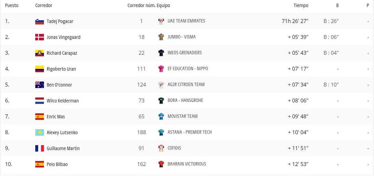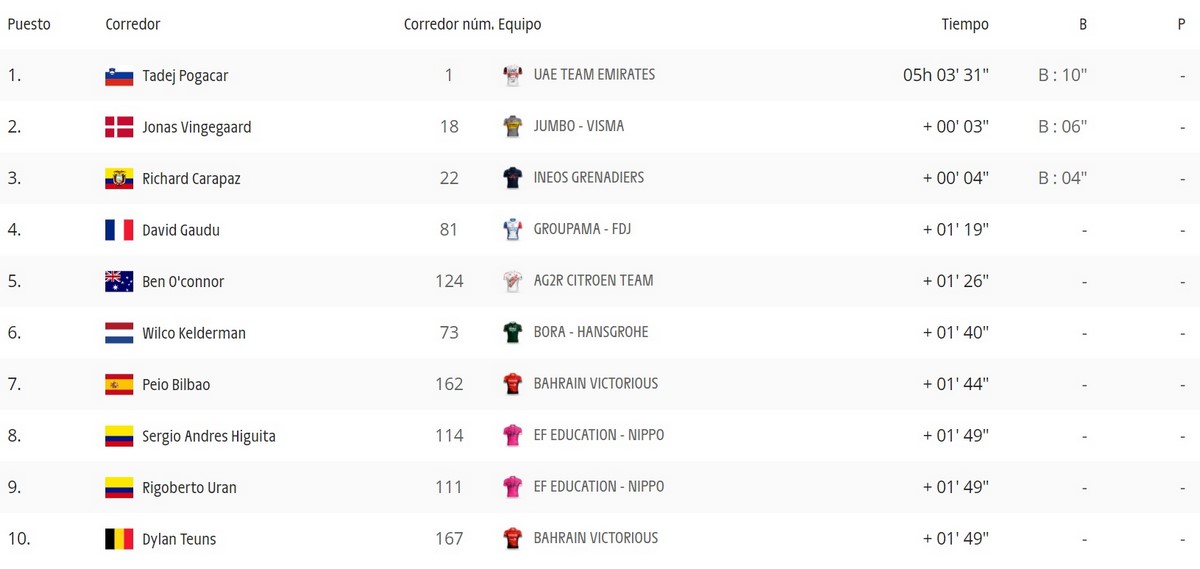El ciclista de Urrao llegó a 1’48 de Tadej Pogacar, quien se adjudicó el triunfo de la fracción de hoy y de paso se afianzó en el liderato.