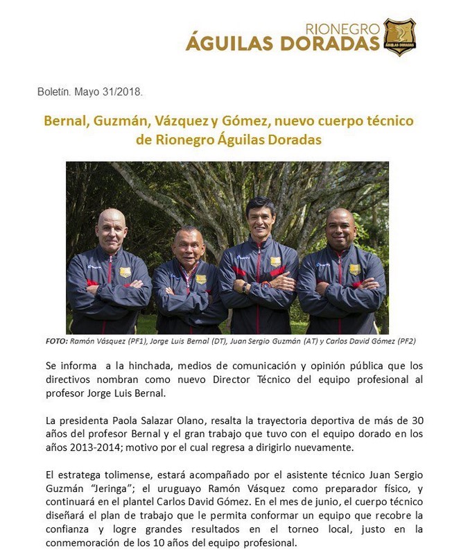 • Minuto30.com- Rionegro Águilas Doradas confirmó este jueves en la tarde, a través de un comunicado, la llegada de su nuevo cuerpo técnico, que está encabezado por un viejo conocido de la institución.