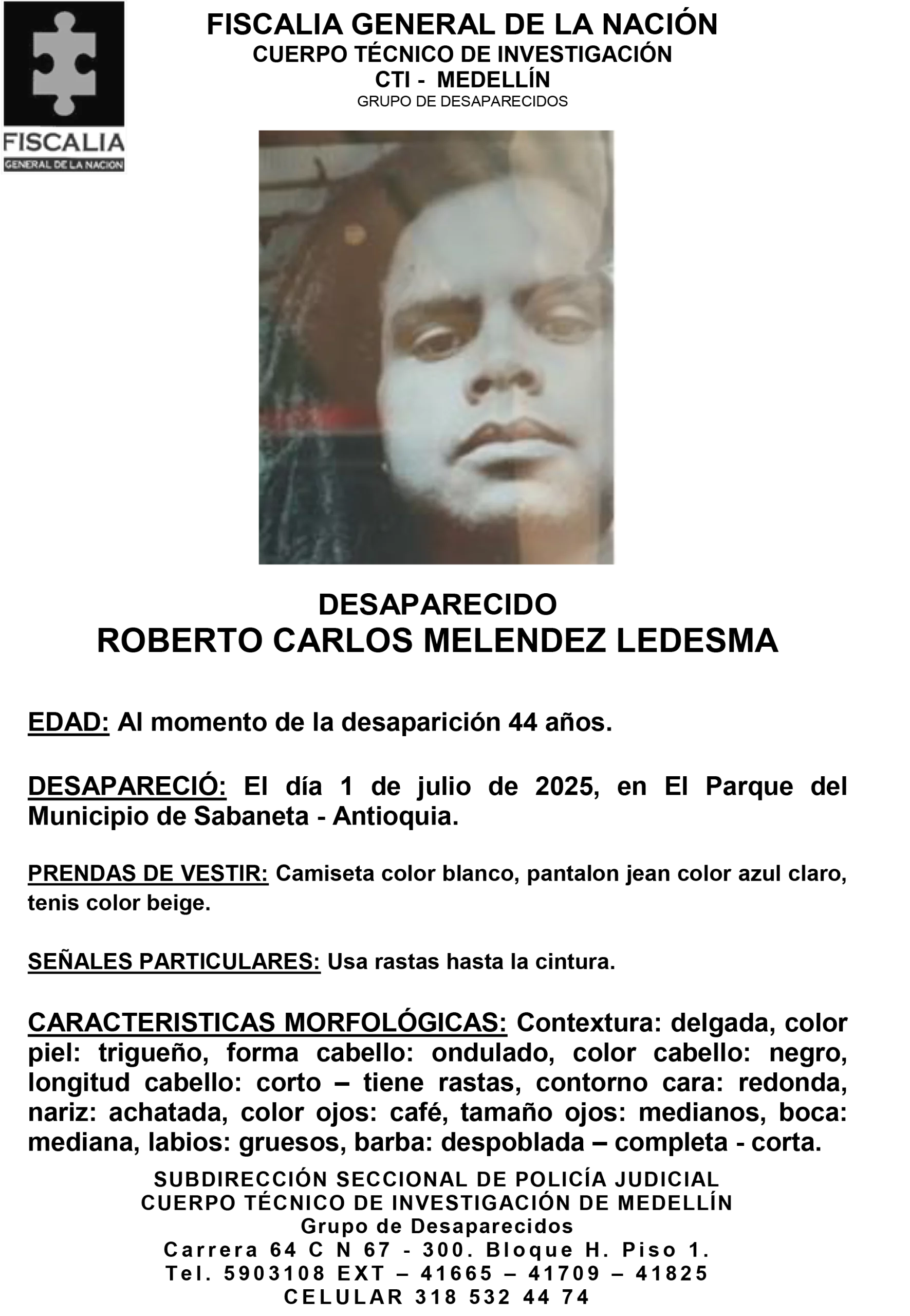 Resumen: Roberto Carlos Meléndez Ledesma desapareció el 1 de julio de 2025 en el parque principal del municipio de Sabaneta, ubicado en el departamento de Antioquia.