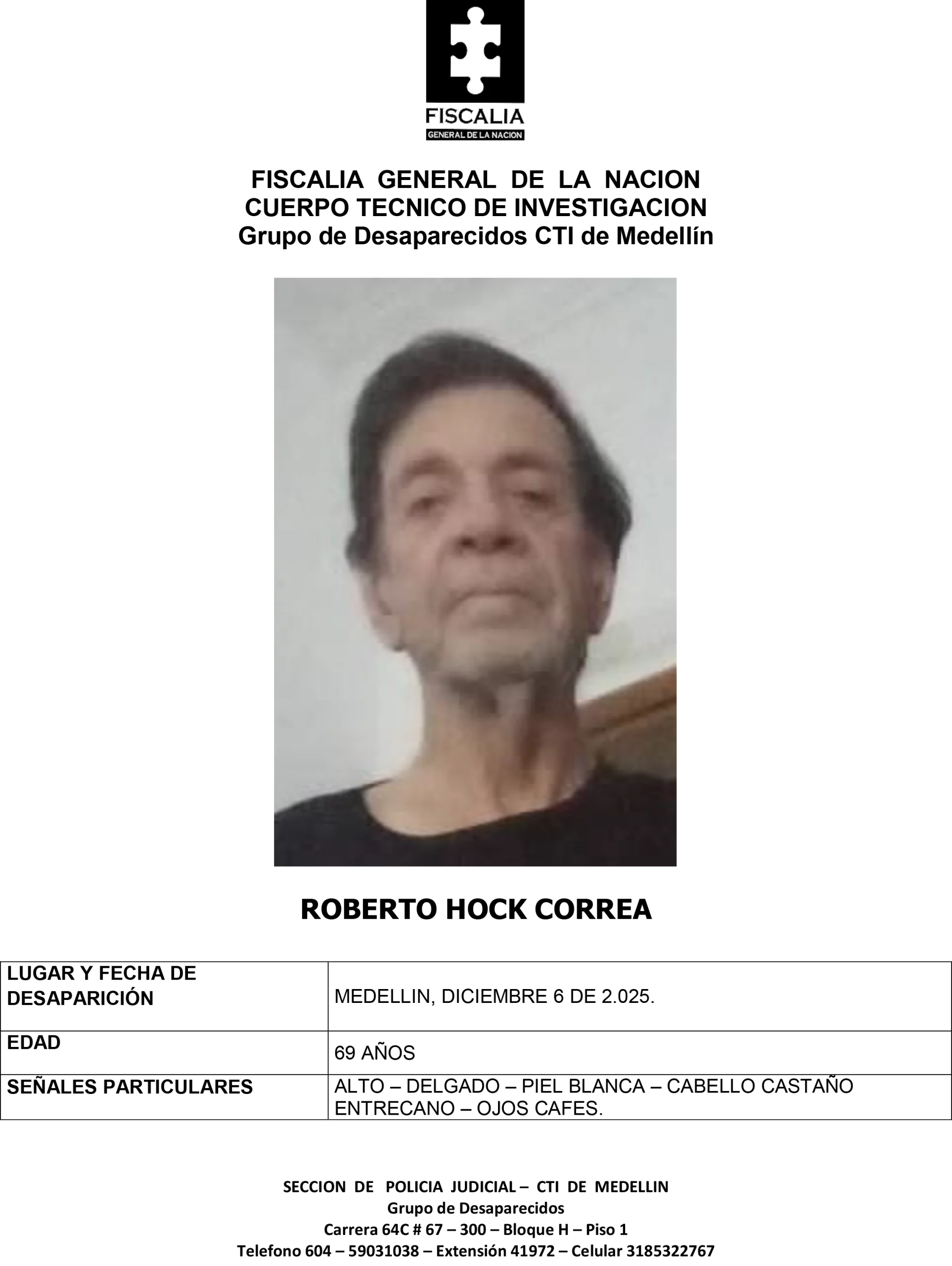 Resumen: Roberto Hock Correa, de 69 años, fue reportado como desaparecido en Medellín el 6 de diciembre de 2025.