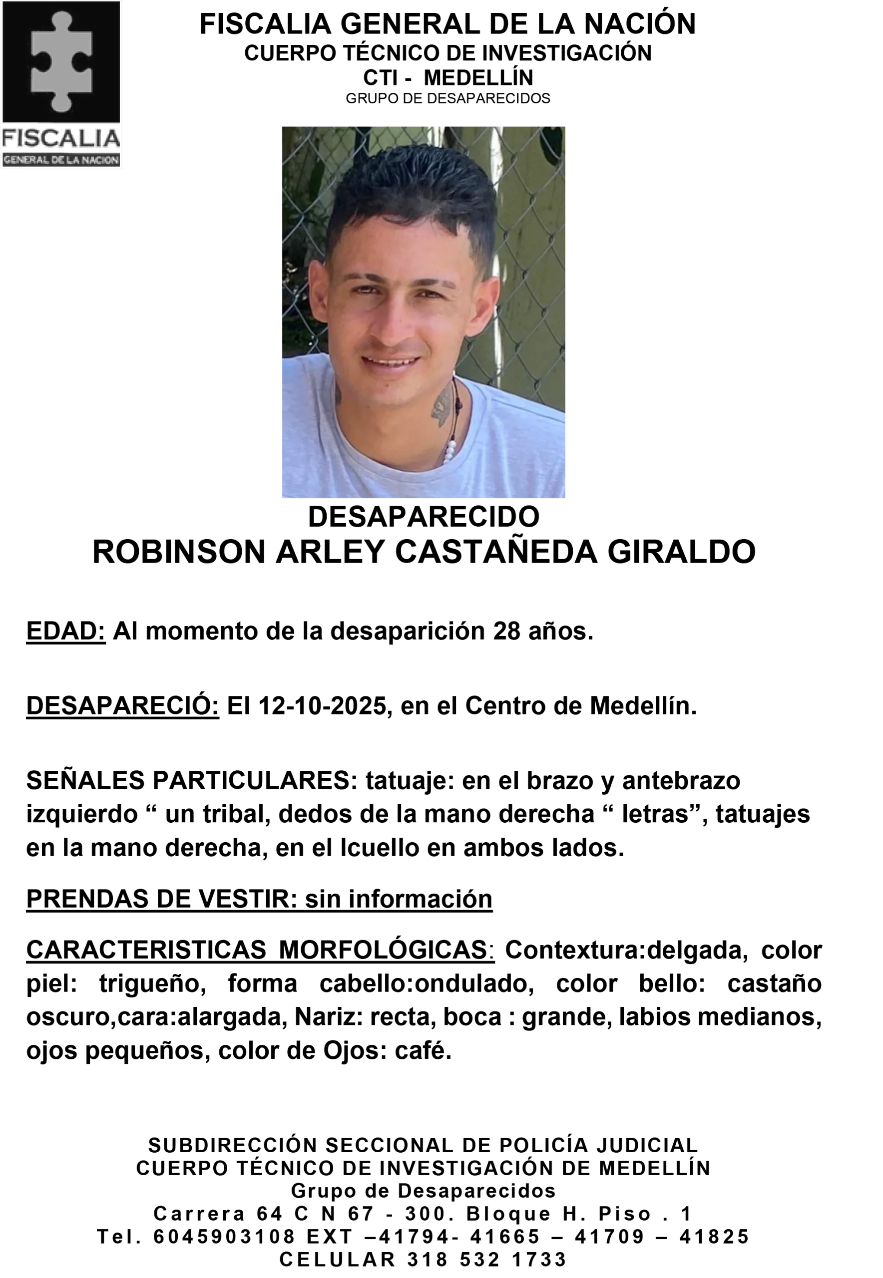 Resumen: Robinson Arley Castañeda Giraldo tenía 28 años al momento de su desaparición, ocurrida el 8 de octubre de 2025 en el centro de Medellín.