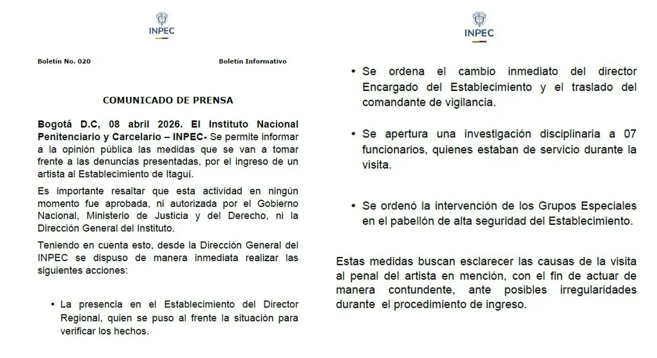 El objetivo de este contundente despliegue es esclarecer los motivos reales detrás de la visita del artista al penal y determinar quiénes facilitaron su ingreso burlando los filtros legales. El INPEC reiteró que actuará “de manera contundente ante posibles irregularidades durante el procedimiento de ingreso”, enviando un mensaje claro contra la corrupción interna.