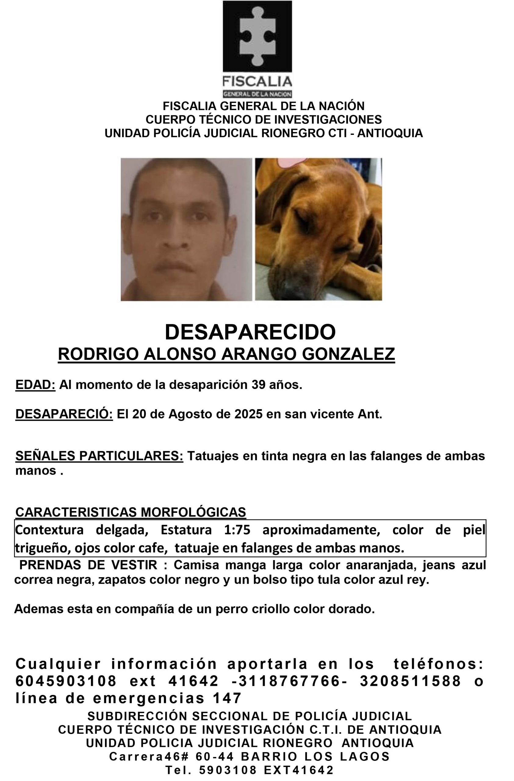Resumen: Rodrigo Alonso Arango González, de 39 años, fue reportado como desaparecido el 20 de agosto de 2025 en el municipio de San Vicente, Antioquia.
