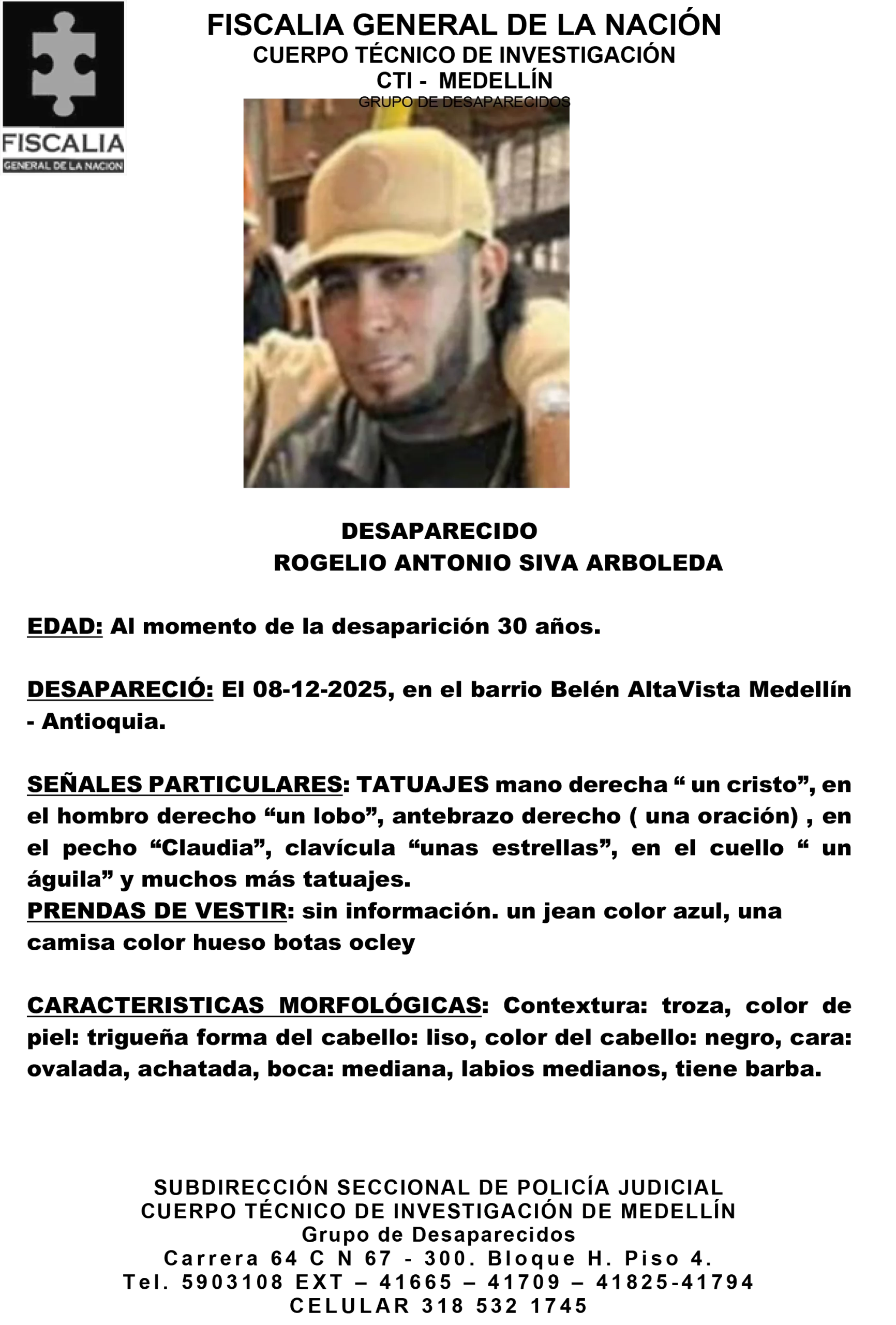 Resumen: Rogelio Antonio Siva Arboleda, de 30 años, desapareció el 8 de diciembre de 2025 en el barrio Belén AltaVista, Medellín, Antioquia.