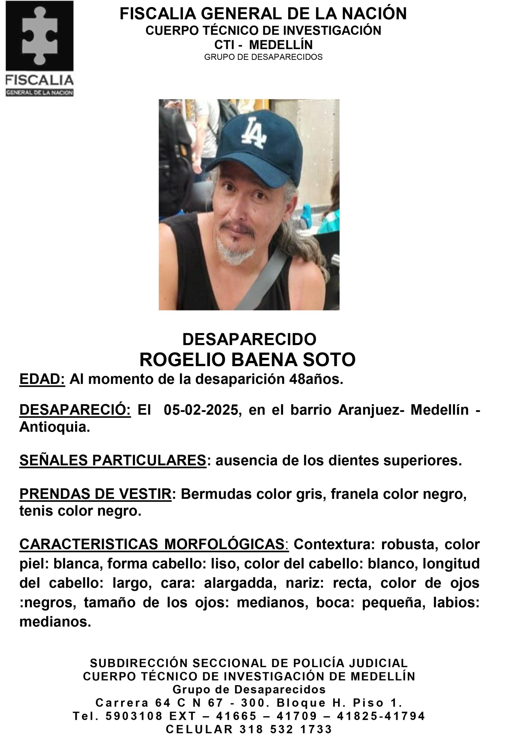 Resumen: Rogelio Baena Soto, de 48 años al momento de su desaparición, desapareció el 5 de febrero de 2025 en el barrio Aranjuez de Medellín, Antioquia.
