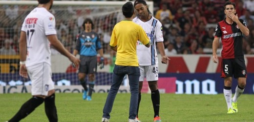 El brasileño Ronaldinho firmó la camiseta a un hincha que entró a la cancha durante las acciones y al final anotó el único gol de su equipo el Querétaro, derrotado 2-1 por el Atlas en la undécima jornada del fútbol mexicano.