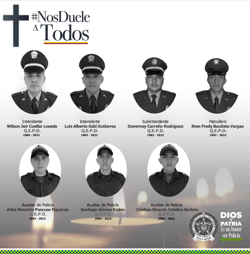 En un acto terrorista perdieron la vida 7 de nuestros compañeros que trabajaban por la convivencia y seguridad en el departamento del #Huila. #NosDueleATodos su pronta partida, acompañamos a sus seres queridos en este duro momento. pic.twitter.com/gXrYCapEMH