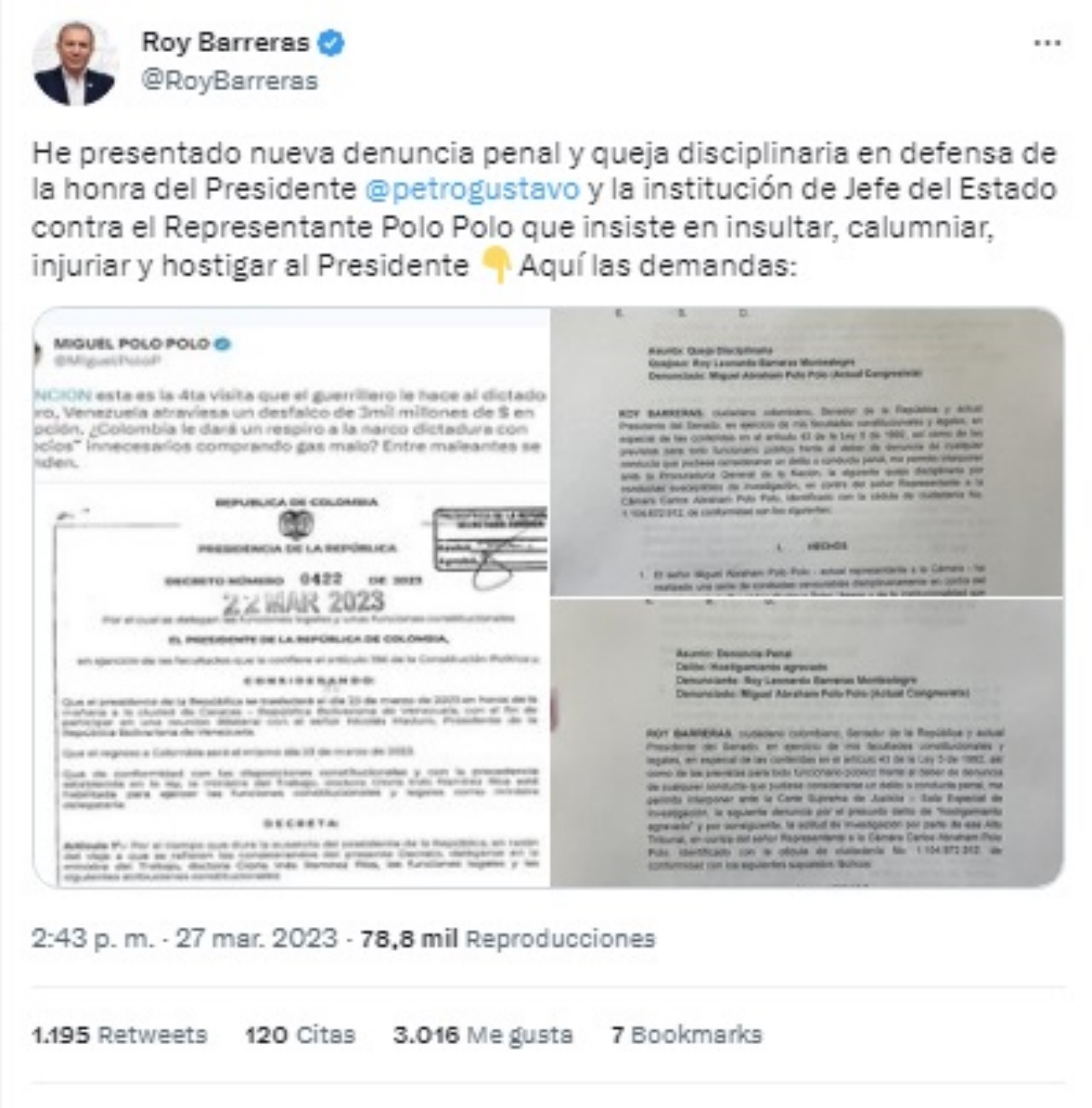 Este lunes, Roy Barrera escribió en su cuenta oficial de Twitter: “He presentado nueva denuncia penal y queja disciplinaria en defensa de la honra del Presidente @petrogustavo y la institución de Jefe del Estado contra el Representante Polo Polo que insiste en insultar, calumniar, injuriar y hostigar al Presidente”.