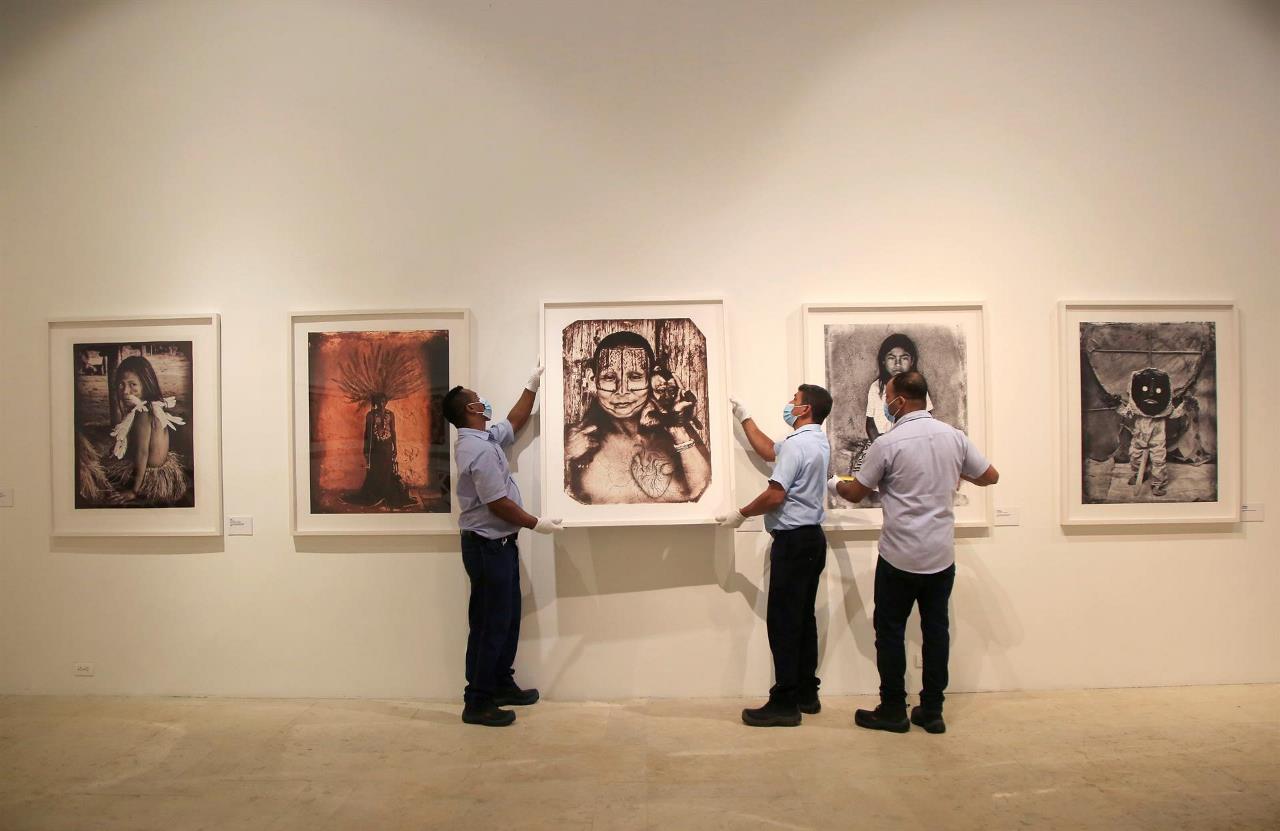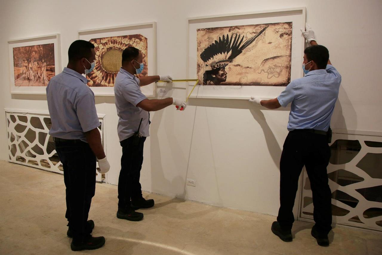 Especialistas en montaje de obras artísticas del Centro de Formación de la Cooperación Española de Cartagena de Indias ajustan hoy los últimos detalles de la exposición “Hijas del agua”, sobre las comunidades indígenas colombianas, del fotógrafo Ruvén Afanador y de la artista Ana González, en Cartagena (Colombia). EFE/Ricardo Maldonado Rozo