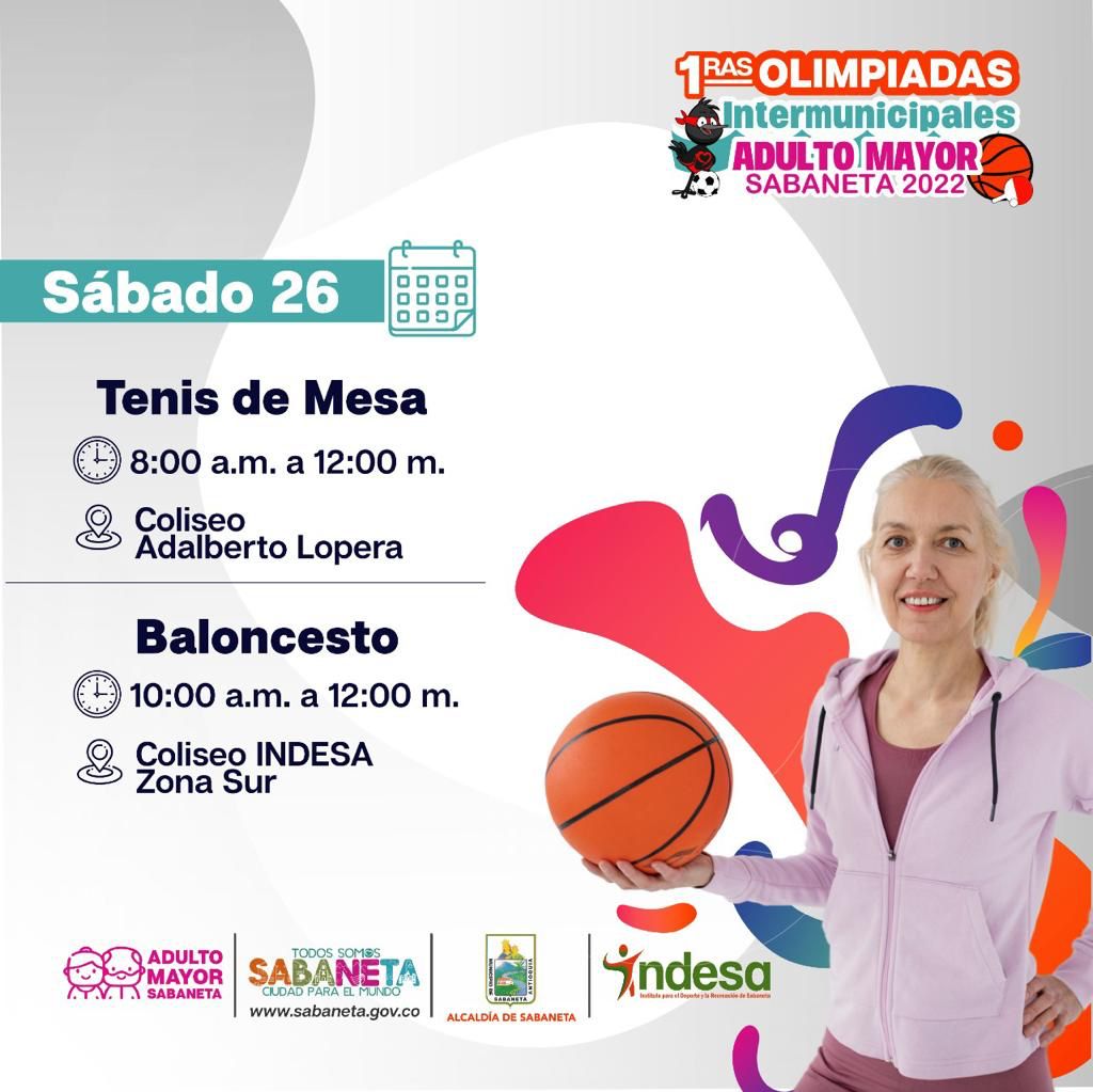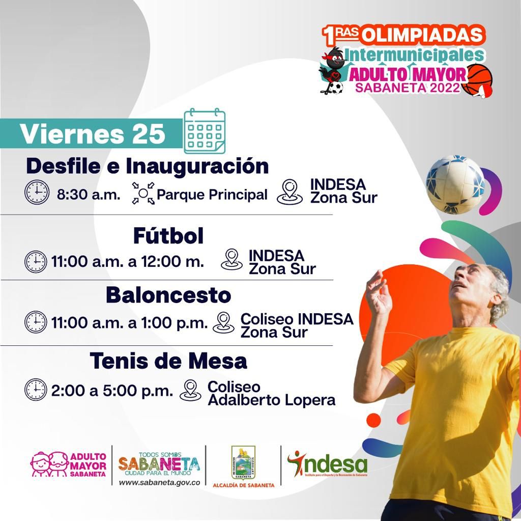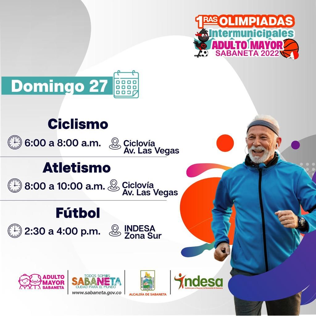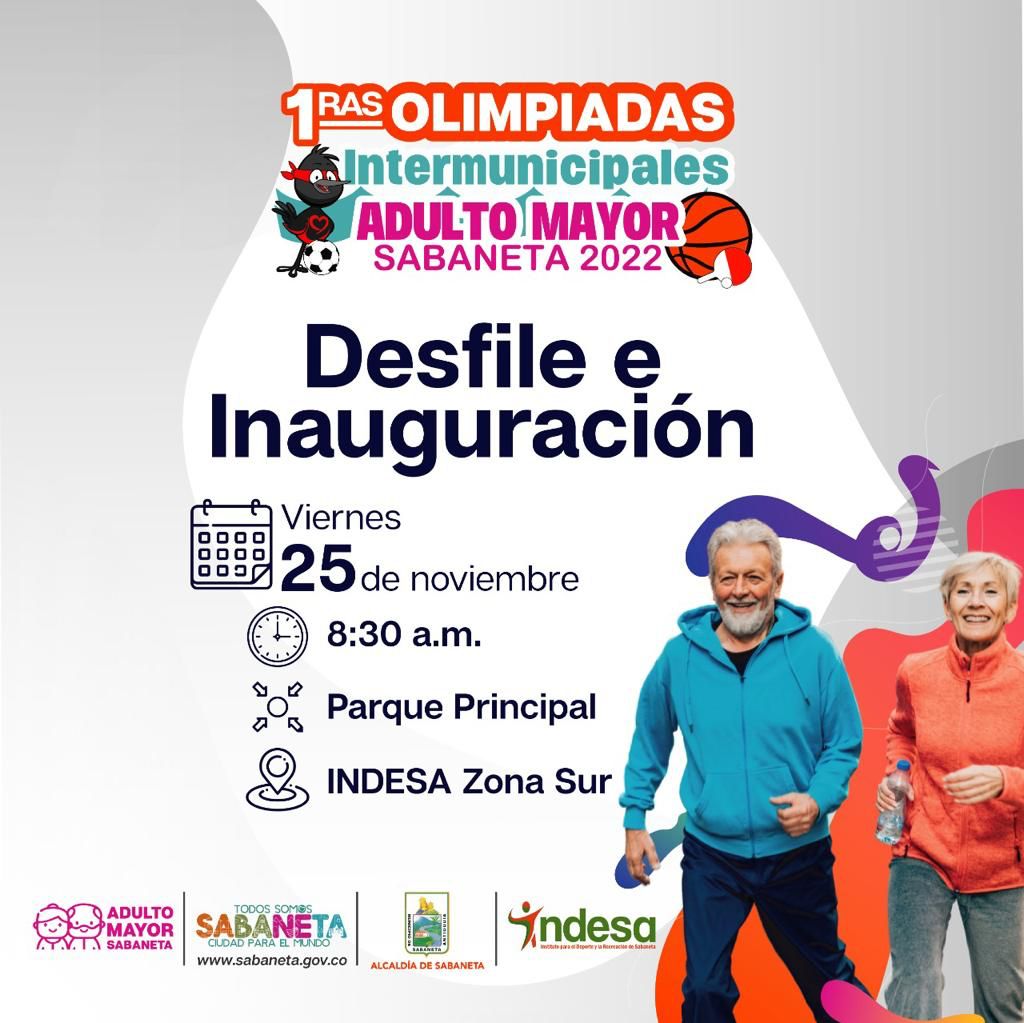 Del 25 al 30 de noviembre, el Municipio de Sabaneta realizará las Primeras Olimpiadas Intermunicipales de Adulto Mayor, con la participación de más de 500 deportistas de siete delegaciones compitiendo en nueve disciplinas.
