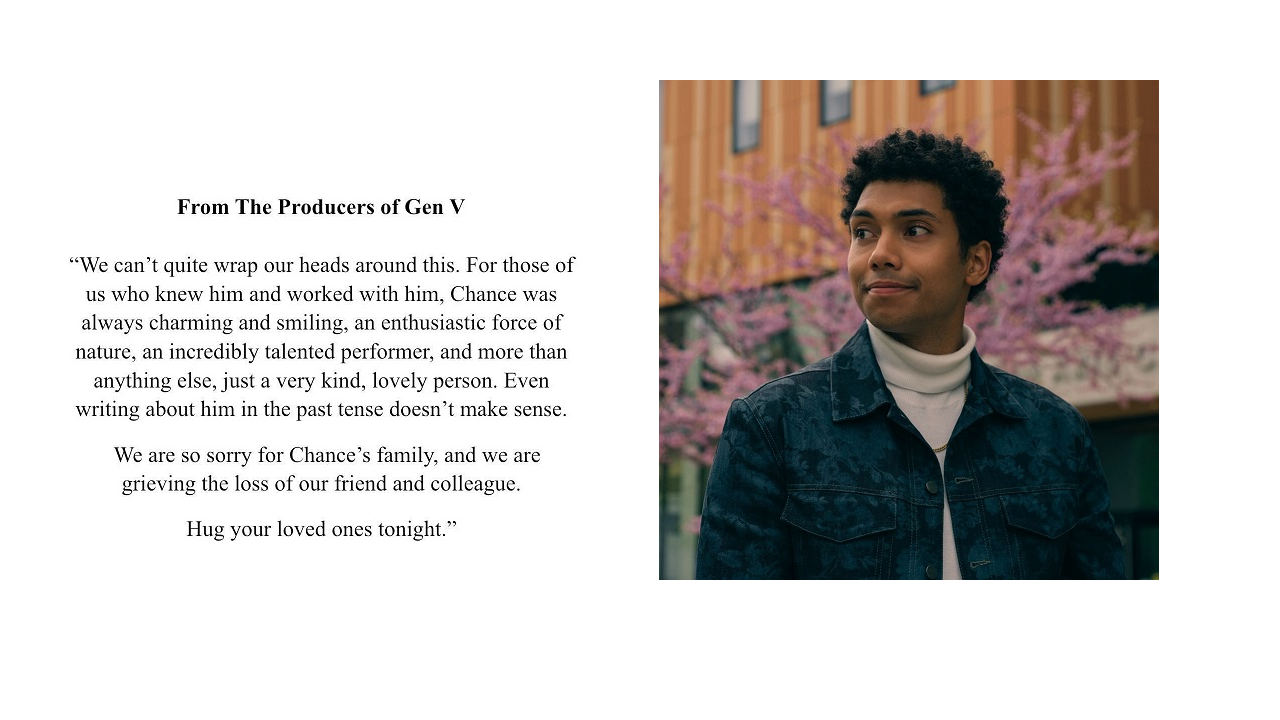 Sony Pictures Televisión productores de Generación V, dejaron ver que esta partida es devastadora.”Para aquellos que lo conocimos, Chance siempre fue encantador y sonriente con una fuerza entusiasta de la naturaleza, un actor increíblemente talentoso “. Los fans se han encargado en redes sociales de hacer un homenaje a Chance Perdomo con videos, fotos y momentos donde se le sonriendo.