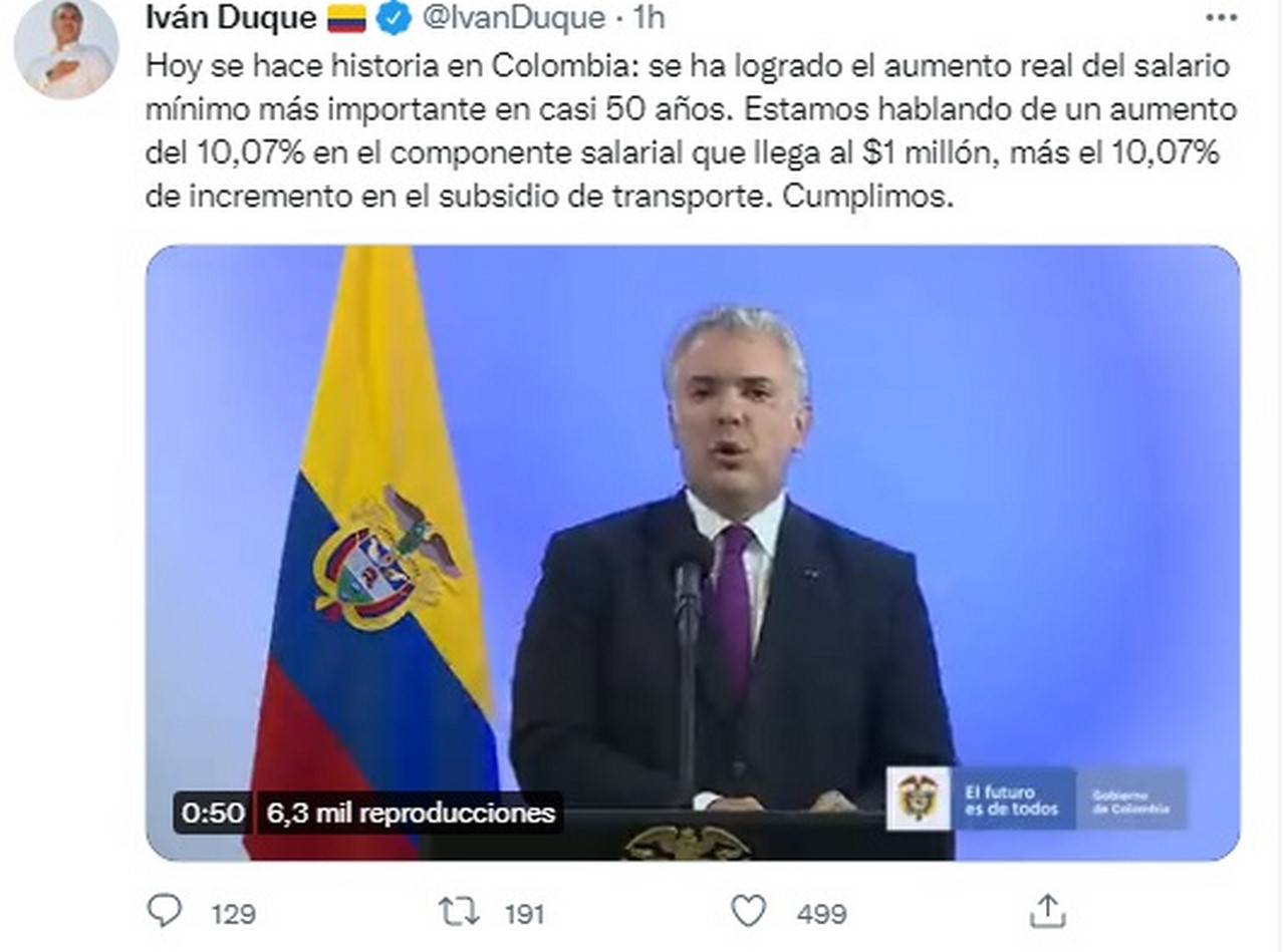 “Estamos hablando de un aumento del 10,07% en el componente salarial; de un aumento del 10,07% también en el auxilio de transporte. Y con esto se está logrando, en el componente salarial, llegar al millón de pesos”, expresó Duque.