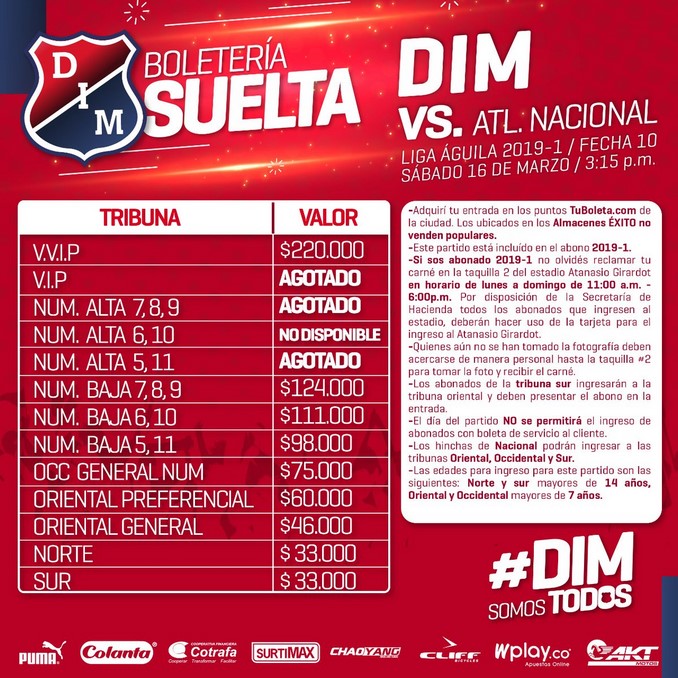 Minuto30.com-  Este miércoles salió a la venta la boletería para el clásico antioqueño entre Independiente Medellín y Atlético Nacional, que se disputará el próximo sábado (3:15 p.m.) en el Estadio Atanasio Girardot.