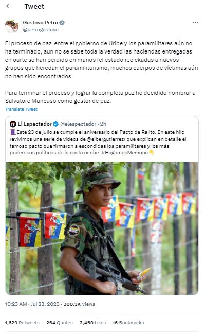 En aquella ocasión, Petro invitó a los demás antiguos jefes de este grupo, a “seguir el ejemplo” de Salvatore Mancuso, con el fin de cumplir los acuerdos en la búsqueda de la paz.