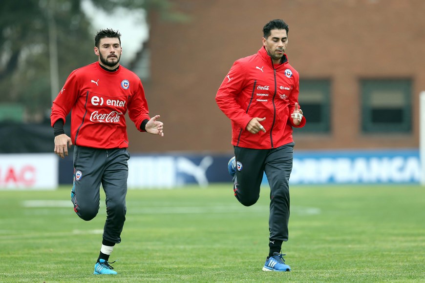Fotografía cedida por la Asociación Nacional de Fútbol (ANFP) de los jugadores de la selección chilena Paulo Garcés (i) y Johnny Herrera (d) hoy, viernes 8 de mayo de 2015, durante un entrenamiento en el complejo Juan Pinto Durán en Santiago de Chile (Chile). EFE