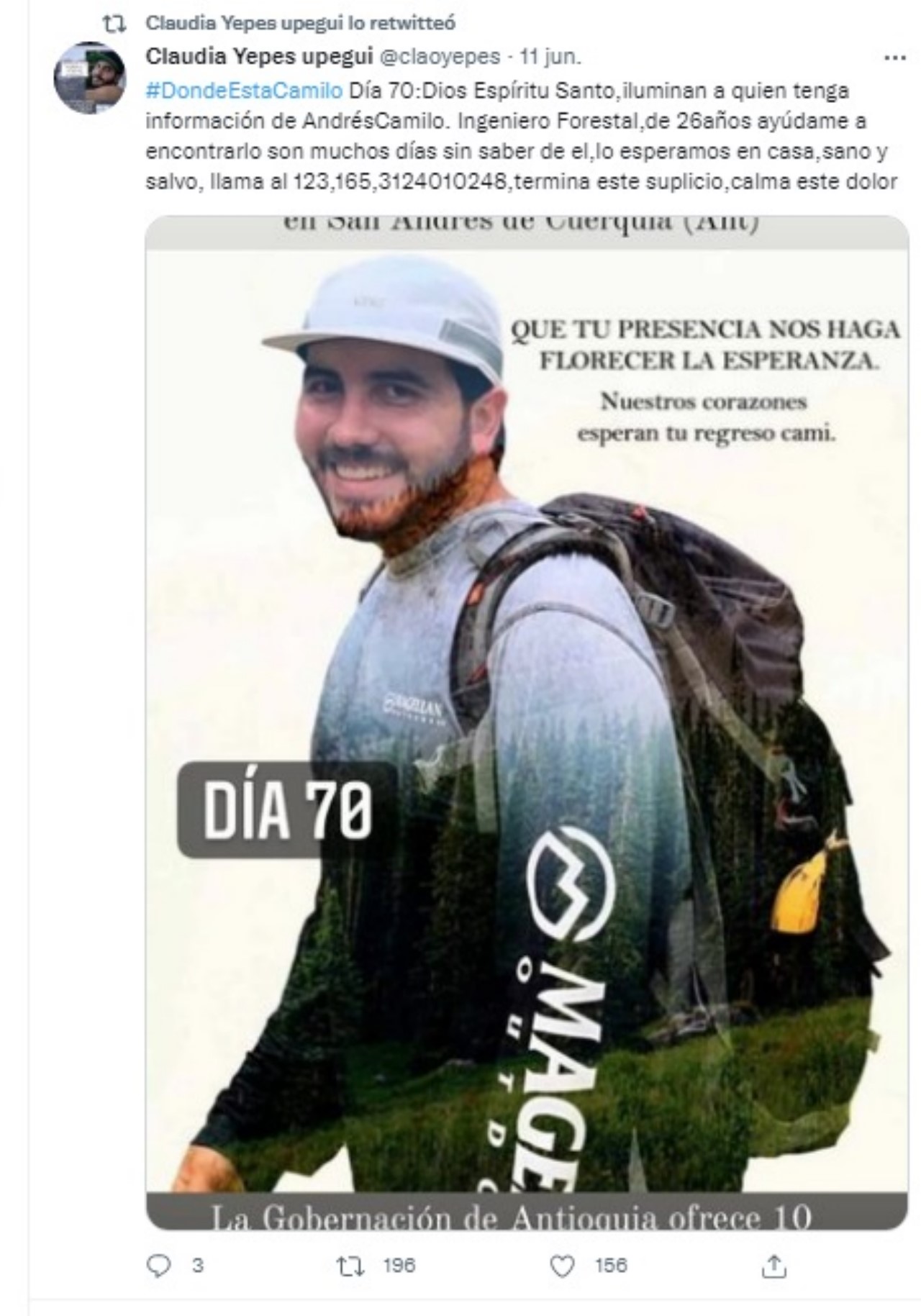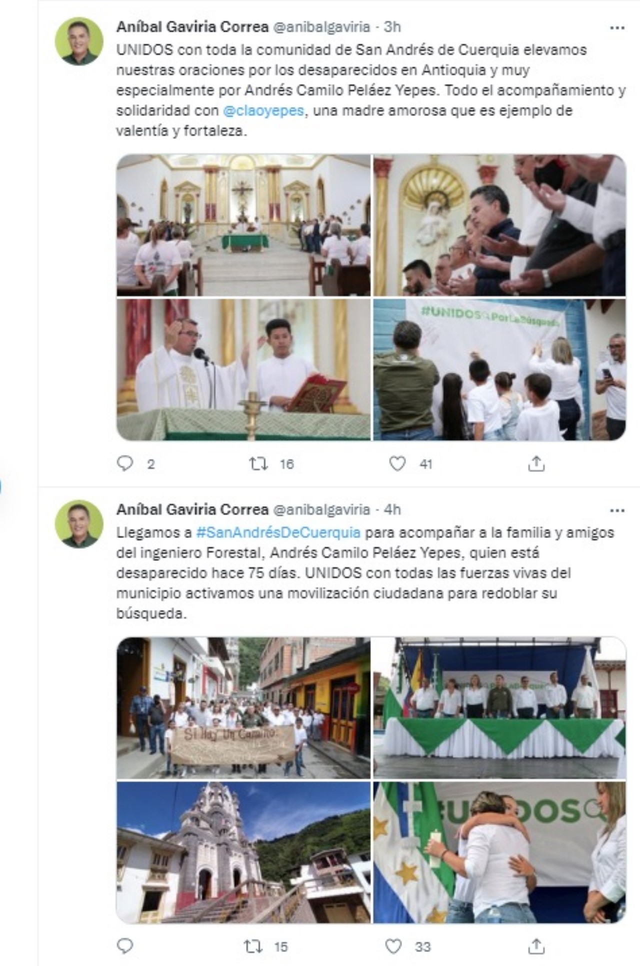 “UNIDOS con toda la comunidad de San Andrés de Cuerquia elevamos nuestras oraciones por los desaparecidos en Antioquia y muy especialmente por Andrés Camilo Peláez Yepes. Todo el acompañamiento y solidaridad con una madre amorosa que es ejemplo de valentía y fortaleza”, expresó el Gobernador de Antioquia en su cuenta de Twitter.