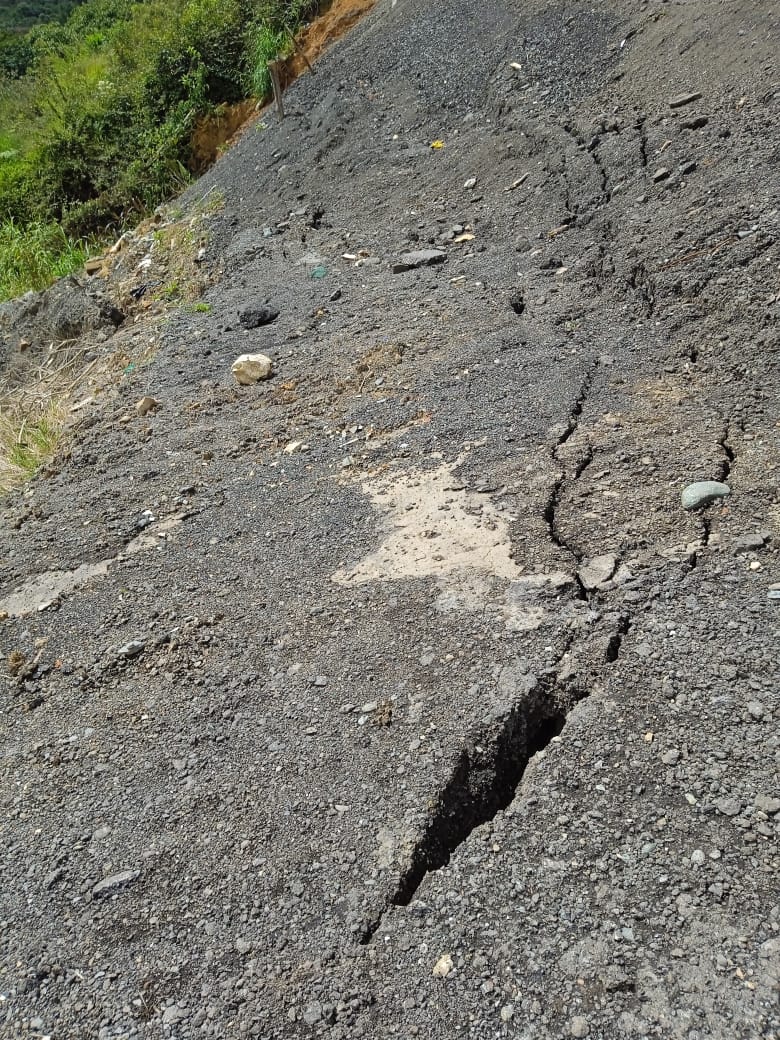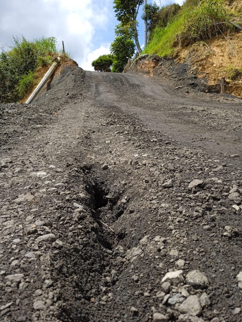 En las fotos se podrá observar como la falla ha ido bajando la carretera, la cual a pesar de que los mismos habitantes han arreglado con plata de sus bolsillos, se ha llenado de grietas y poco a poco se va desbordando nuevamente.