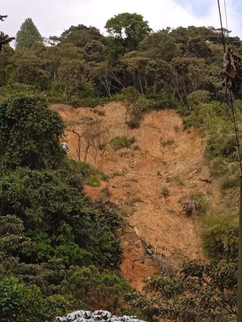 “El inclinamiento que se ve en las fotos y los deslizamientos caen a una quebrada, que si llega a represarse puede causar una terrible tragedia. Eso es lo que más tememos y con estas lluvias, Dios nos ampare”. Agregó el habitante.