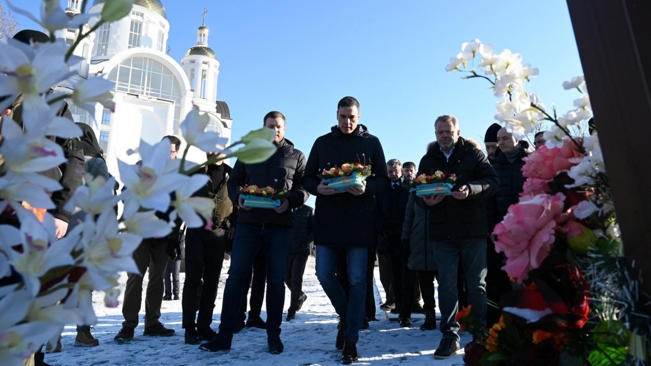 Pedro Sánchez (c) realiza una ofrenda floral a los caídos en la guerra durante su visita el barrio de Irpin en Bucha. EFE/ Moncloa/borja Puig De La Bellacasa SOLO USO EDITORIAL