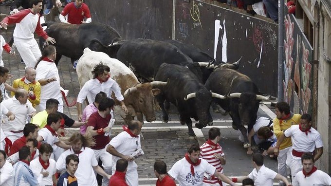 En la curva de la Estafeta uno ha resbalado y ha caído, y con él se han chocado otros dos morlacos, lo que ha hecho que el grupo se separa y uno de ellos quedara unos metros más atrás.