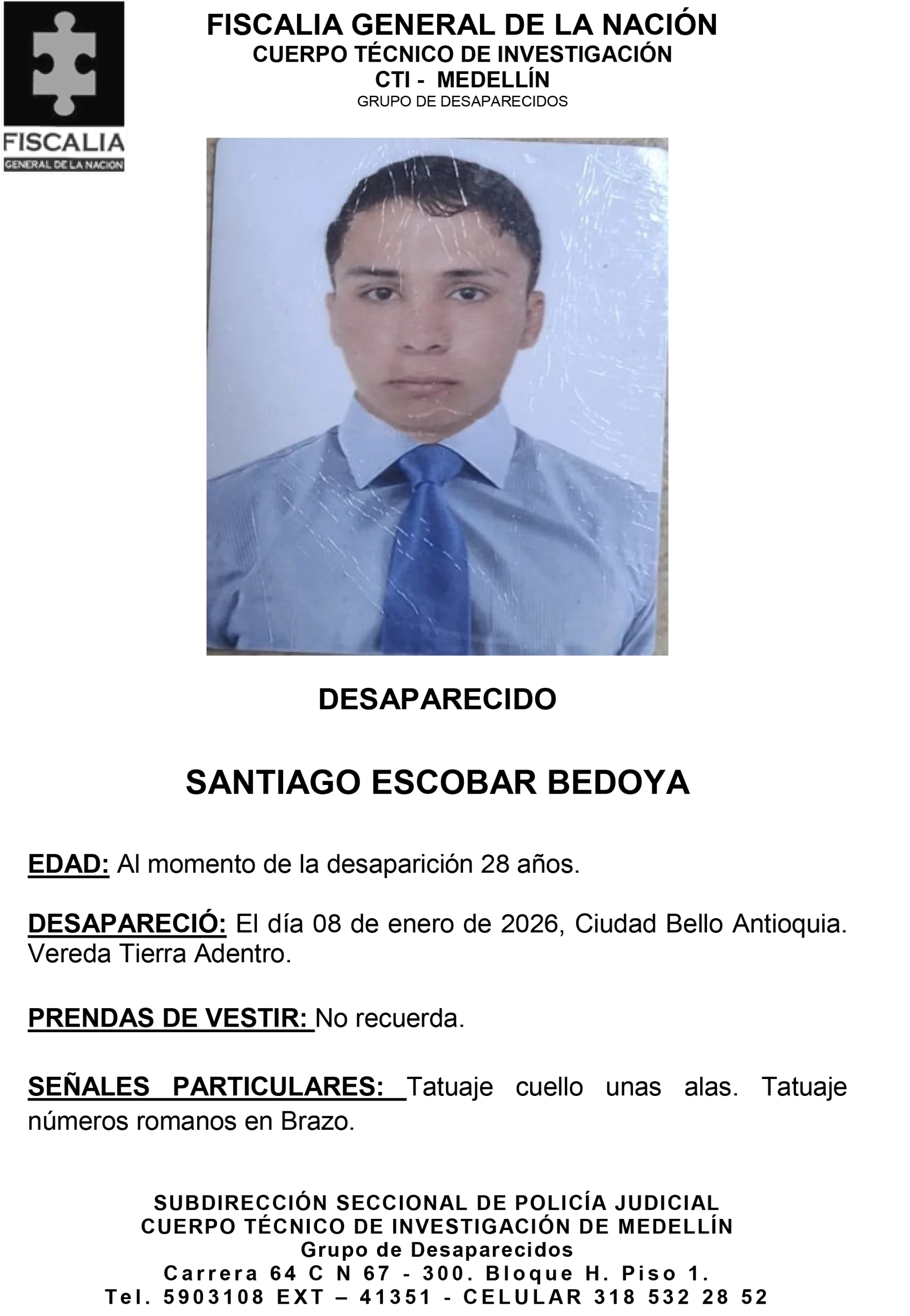 Resumen: Santiago Escobar Bedoya tenía 28 años al momento de su desaparición. El hecho ocurrió el 8 de enero de 2026 en el municipio de Bello, Antioquia, específicamente en la vereda Tierra Adentro.