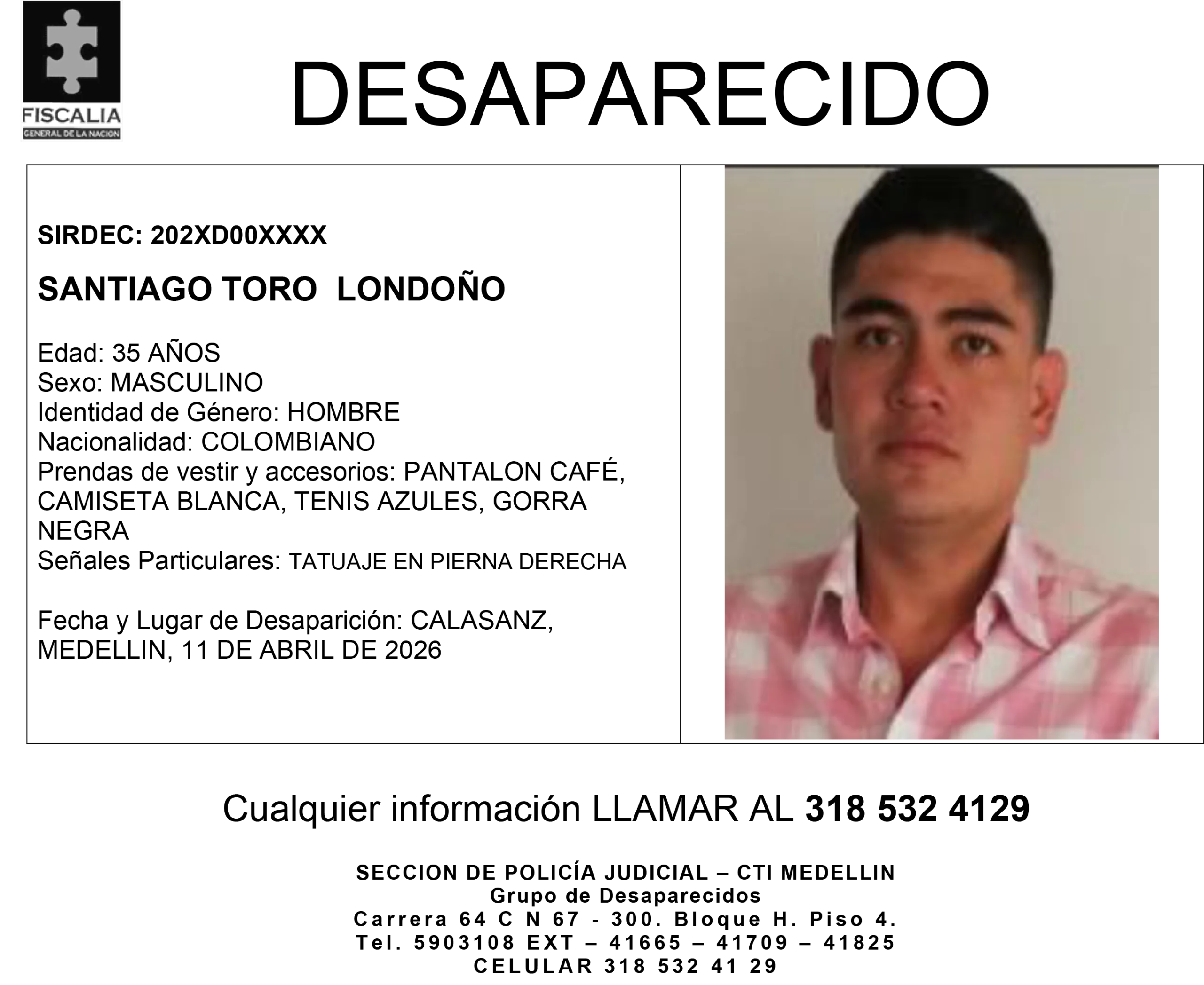 Presenta como señal particular un tatuaje en la pierna derecha. La desaparición ocurrió el 11 de abril de 2026 en el sector de Calasanz, en Medellín, lo que ubica el caso en un contexto urbano específico dentro de la ciudad.
