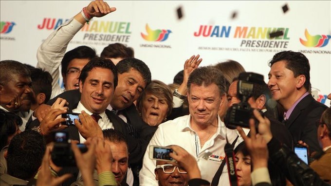 El presidente colombiano, Juan Manuel Santos, continúa al frente de las encuestas sobre intención de voto para las elecciones del 25 de mayo, pero su favoritismo sigue bajando, según una nueva encuesta divulgada hoy.