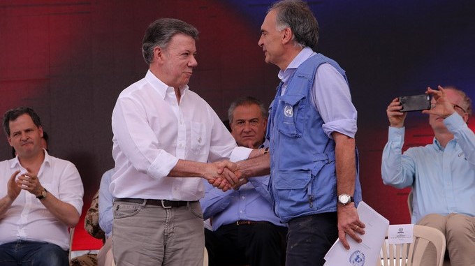 El presidente de Colombia, Juan Manuel Santos (i), y el director de la misión en Colombia de Naciones Unidas, Jean Arnault