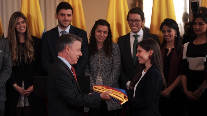 El presidente Juan Manuel Santos entregó la bandera nacional a los jóvenes que representarán al país en la cumbre One Young World, que comenzará este miércoles en Bogotá.