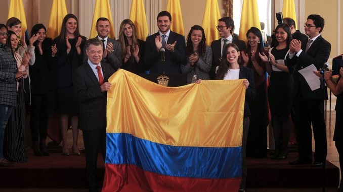 Los jóvenes “están aquí porque son líderes, porque tienen mucho que aportar, muestren este país maravilloso que tenemos”, dijo Santos al entregar la bandera en la Casa de Nariño, según recoge un comunicado de la Presidencia.