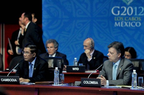 México – 18 de junio de 2012 | Foto: Felipe Ariza – SIG | El Presidente de la República, Juan Manuel Santos, acompañado por el jefe de la delegación de Cambodia, en la primera sesión plenaria de la Cumbre del G-20, que se inició este lunes en la ciudad de Los Cabos, en la región mexicana de Baja California.