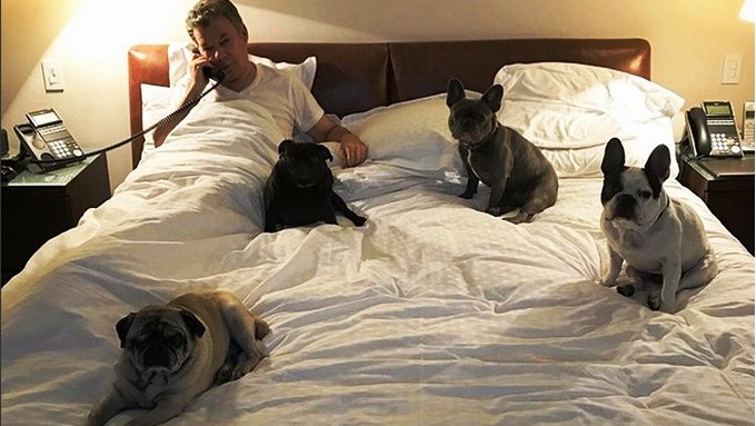 El presidente Santos junto a sus cuatro mascotas. Foto tomada de Instagram.