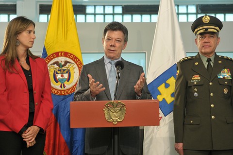 Bogotá – 10 de julio de 2012 | Foto: Andrés Piscov – SIG | El Presidente Juan Manuel Santos acompañado por la Alta Consejera para la Equidad de la Mujer, Cristina Plazas, y el Director de la Policía, general José Roberto León Riaño, durante la presentación de la Ley contra la Violencia Intrafamiliar, en el Cavif de Paloquemao, en Bogotá.