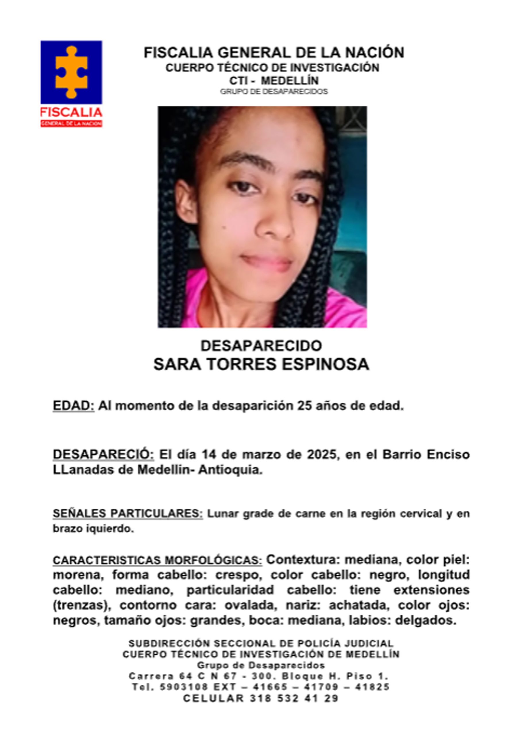 Sara Torres Espinosa desapareció el 14 de marzo de 2025 en el sector de Llanadas, ubicado en el Barrio Enciso de Medellín, Antioquia. Al momento de su desaparición tenía 25 años de edad.
