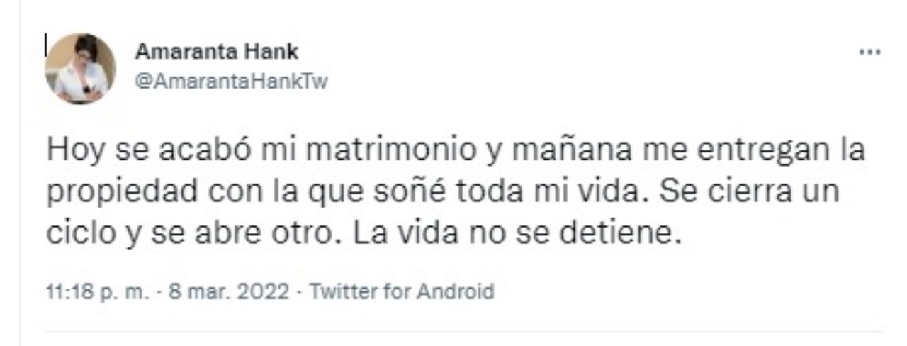 “Hoy se acabó mi matrimonio y mañana me entregan la propiedad con la que soñé toda mi vida. Se cierra un ciclo y se abre otro. La vida no se detiene”, afirmó en su cuenta de Twitter.