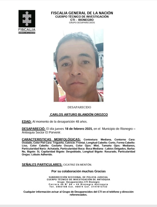 Blandón, de 48 años, desapareció el jueves 18 de febrero de 2025 en el municipio de Rionegro, Antioquia, en el sector El Porvenir.