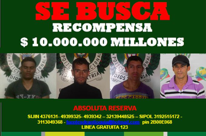 Minuto30.com .- La Policía Antioquia ofrece diez millones de pesos de recompensa, por información que lleve a la recaptura de los sujetos que se fugaron de la Cárcel municipal de Abejorral.