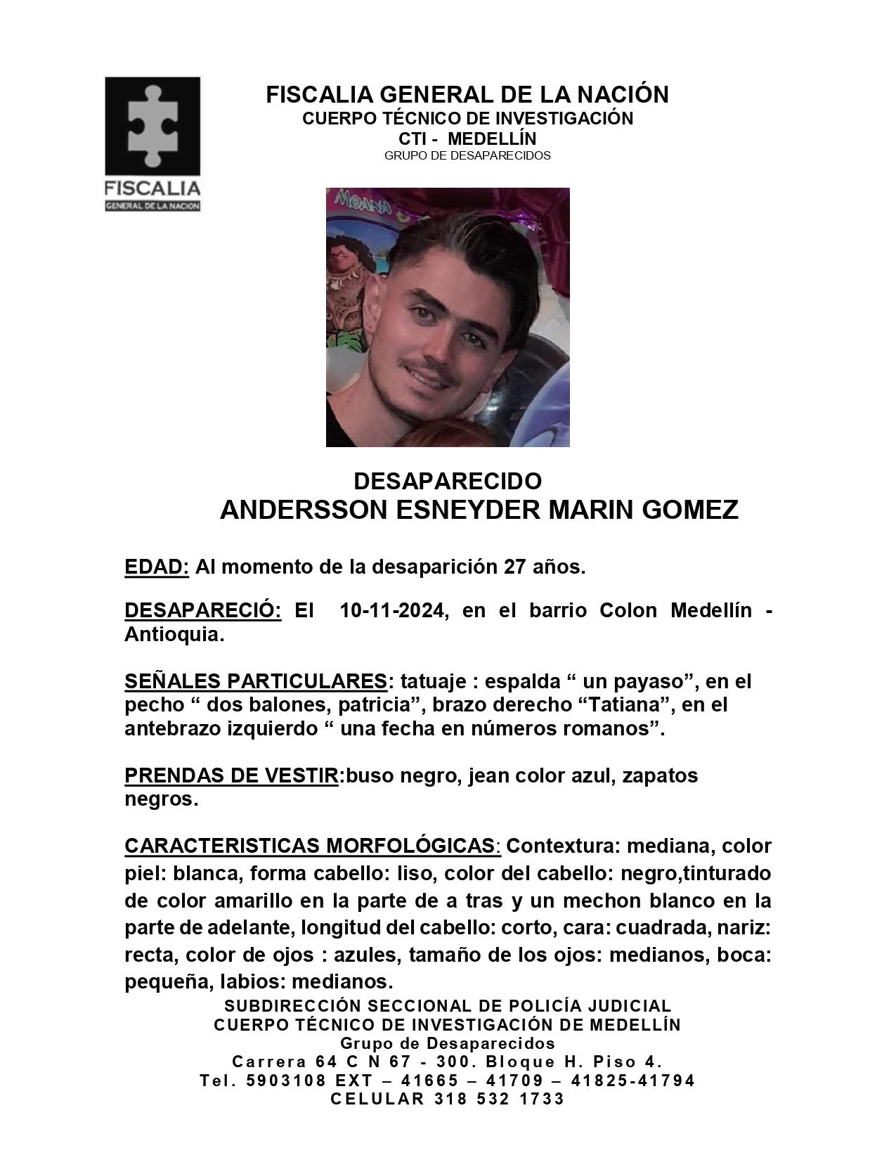 Resumen: Se solicita ayuda para localizar a Andersson Esneyder Marín Gómez, un hombre de 27 años desaparecido el 10 de noviembre de 2024 en el barrio Colón, Medellín. Presenta tatuajes distintivos y las autoridades piden colaboración para encontrarlo.