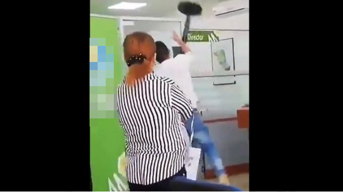 En medio de las reacciones el esposo le dice al hombre que salga de la oficina para que se enfrenten, pero nadie sale del lugar, ni el propio vigilante es capaz de calmar al desenfrenado hombre.