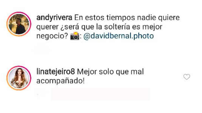 En un reciente post de Instagram, el cantante Andy Rivera comentó que: “En estos tiempos nadie quiere querer ¿será que la soltería es mejor negocio?”, pero la respuesta de su ex, Lina Tejeiro se robó todo el show.